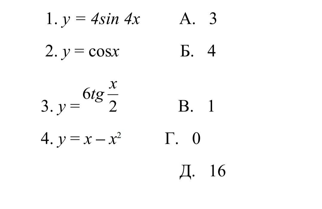 1) y=4sin4x; 2) y=cos x; 3) y=6tg(x/2); 4) y=х-х².