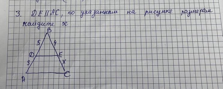 DB/AD = BE/BC ; ----> 5/( 5 + 3 ) = 4/( 4 + x ) ; ----> 4 +x = ( 4 * 8)/5 ;