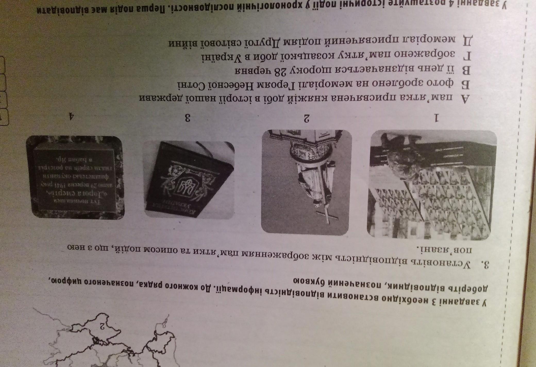 У завданнi 3 необхідно встановити вiдповiднiсть інформації. До кожного рядка, позначеного цифрою, доберіть вiдповiдник, позначений буквою 3. Установіть відповідність між зображенням пам'ятки та описом полiй, що з нею пов'язані. И ** pig Jose cago Miy 1 2 3 А пам'ятка присвячена княжій добі в історії нашої держави фото зроблено на меморіалі Героям Небесної Сотні Б В ЇЇ День відзначається щороку 28 червня г зображено пам'ятку козацької доби в Україні Д меморіал присвячений подіям Другої світової війни he! 4 N 3 E