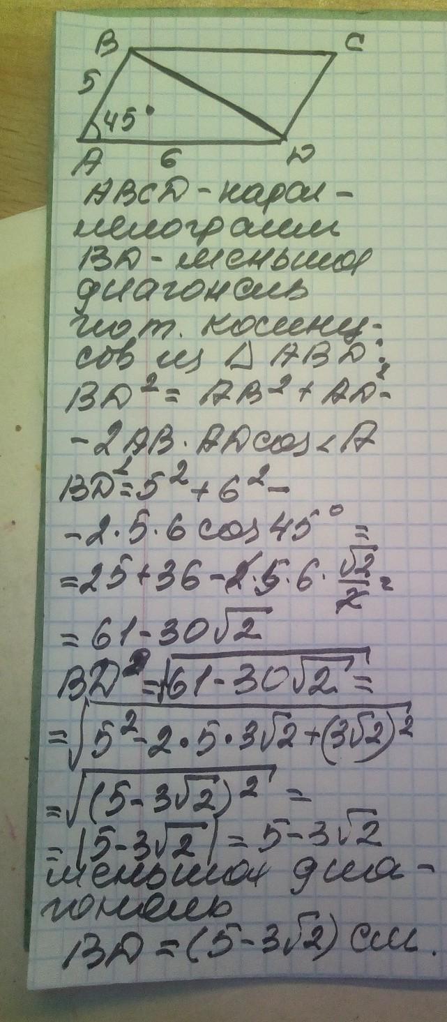 Знайдіть меншу діагональ паралелограма, дві сторони якого дорівнюють 6 см і 5 см, а кут між ними – 45°.