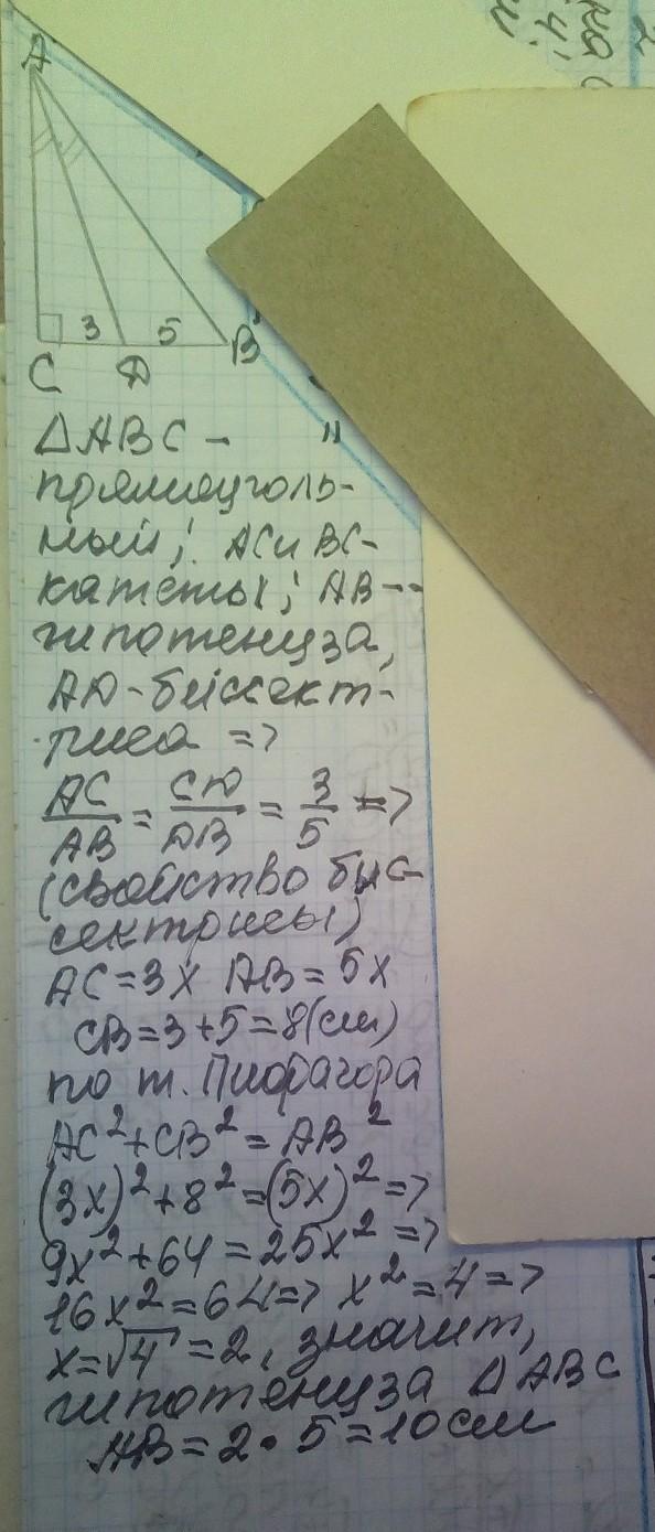 Биссектриса острого угла прямоугольного треугольника делит катет на отрезки 3 см и 5 см. Найти гипотенузу треугольника