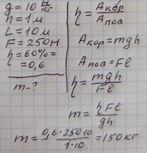 Висота похилої площини дорівнює 1 м, а довжина - 10 м. для підняття вантажу цієї площиною потрібні зусилля в 250Н. ККД похилої поощини 60%. Визначити масу вантажу