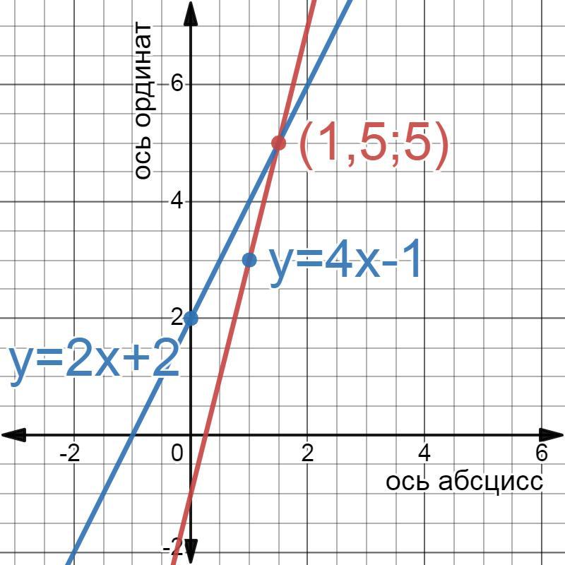 Побудуйте в одній системі координат графіки функцій y=4x-1 і y=2x+2 і знайдіть координати точки їх перетину