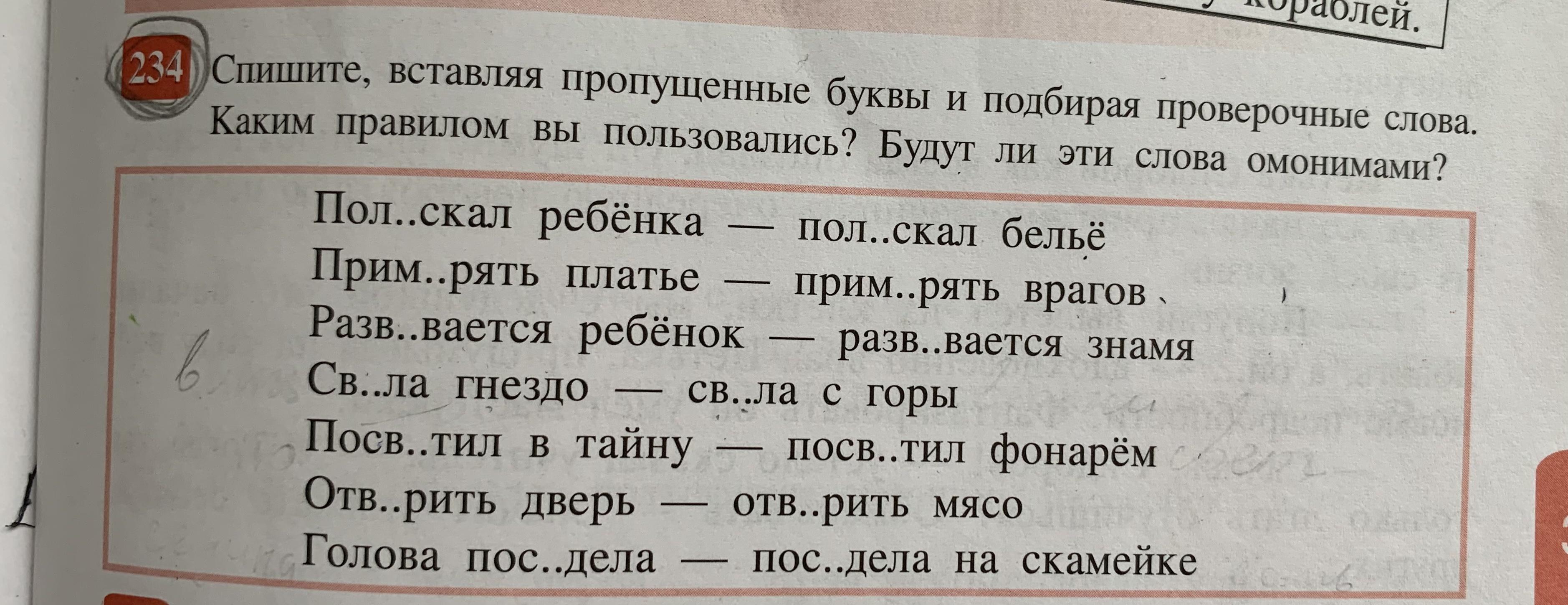 Полоскать ребёнка - полоскать бельё Примерять платье - примереть врагов Развивается ребёнок - развивается знамя. Свела гнездо - свела с горы. Посветил в тайну - посветил фонарём Отварил дверь - отварил мясо. Голова поседела - поседела на лавочке.