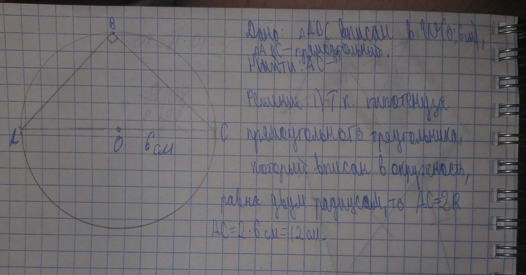 Радіус кола, описаного навколо прямокутного трикутника, дорівнює 6 см Чому дорівнює гіпотенуза трикутника? Можна з малюнком і розв'язком.