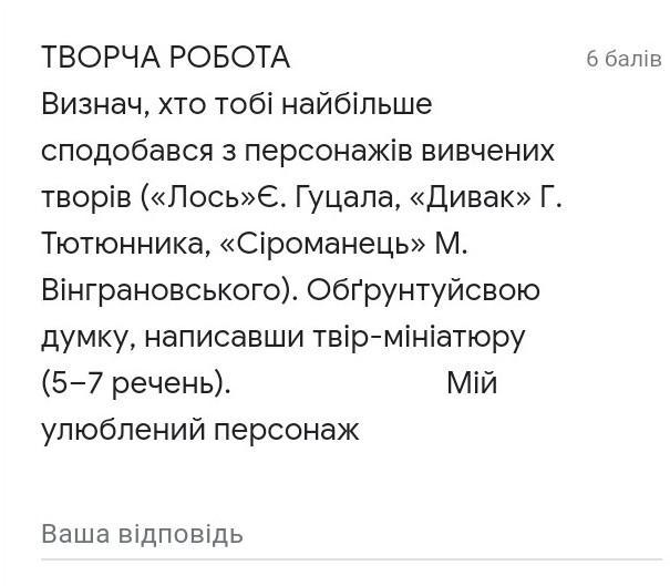 ТВОРЧА РОБОТА Визнач, хто тобі найбільше сподобався з персонажів вивчених творів («Лось»Є. Гуцала, «Дивак» Г. Тютюнника, «Сіроманець» М. Вінграновського). Обґрунтуйсвою думку, написавши твір-мініатюру (5-7 речень). Мій улюблений персонаж 6 балів срочно будьласка ДОПОМОЖІТЬ ДАЮ 50 БАЛІВ