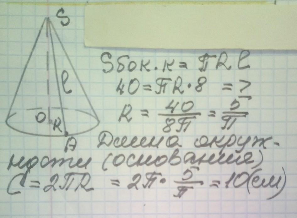 Твірна конуса дорівнює 8 см, а площа йогобічної поверхні 40см2. Знайдіть довжину радіуса кола.