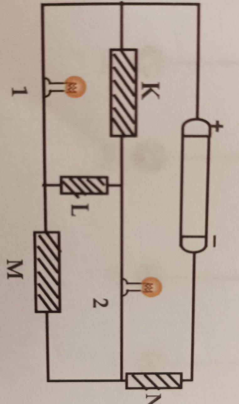 Что нужно сделать чтобы в электрической цепи обе лампы 1 и2 загорались (K,L,M,N стержни из пластика)?
