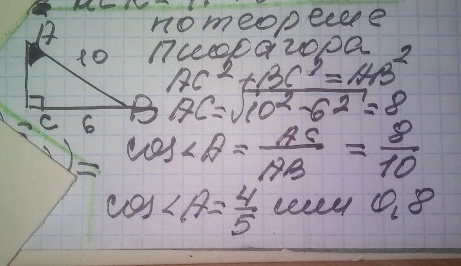 У трикутнику ABC - C = 90º , AB = 10 см , ВС = 6 см . Чому дорівнюе соs А ?