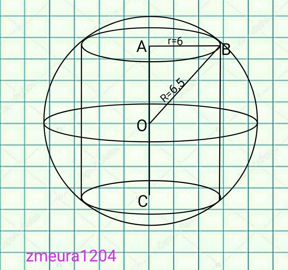 У кулю, радіус якої дорівнює 6,5 см, вписано циліндр,радіус основи якого 6 см. Знайти площу бічної поверхні циліндра.
