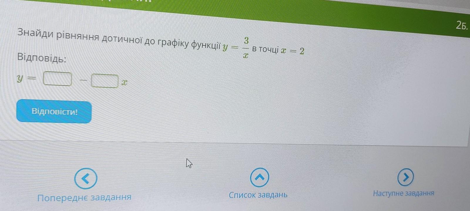 y' = ( 3/x )' = - 3/x² ; f '( x₀ ) = - 3/2² = - 3/4 = - 0,75 . Підставляємо :