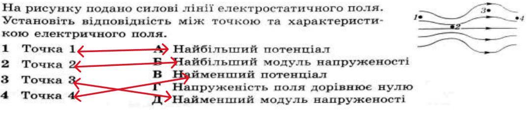 Пояснення: Потенціал зменшується в напрямку ліній напруженості; модуль напруженості більший де більша щільність ліній напруженості