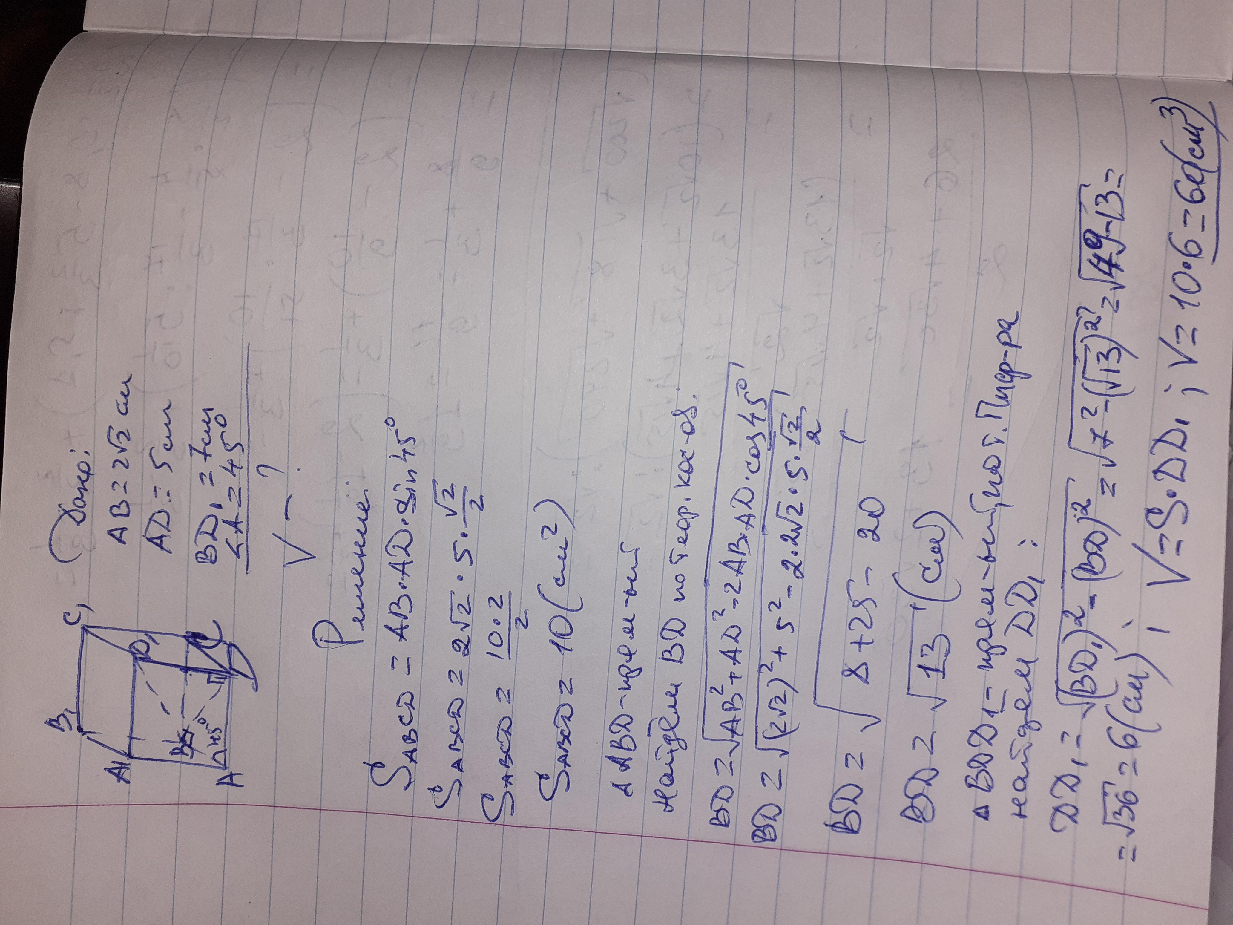 Стороны основания прямого параллелепипеда 2√2 и 5 см, а угол между ними 45°. Найдите обьем (см3) параллелепипеда, если его меньшая диагональ равна 7 см.