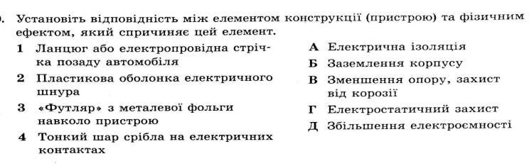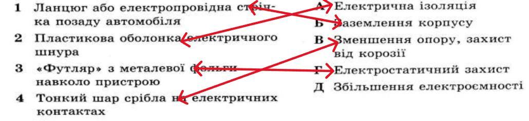 Пояснення: Через ланцюг заряди, які утворилися на корпусі автомобіля переходять в землю; для ізоляції дротів їх поміщають в пластикову оболонку; всередину "футляра" з металевої фольги не проникають зовнішні електричні поля; тонкий шар срібла захищає поверхню від корозії.
