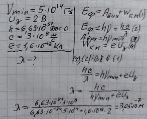 довжина хвилі діючого на катод випромінювання, якщо затримуюча напруга дорівнює 2 В?