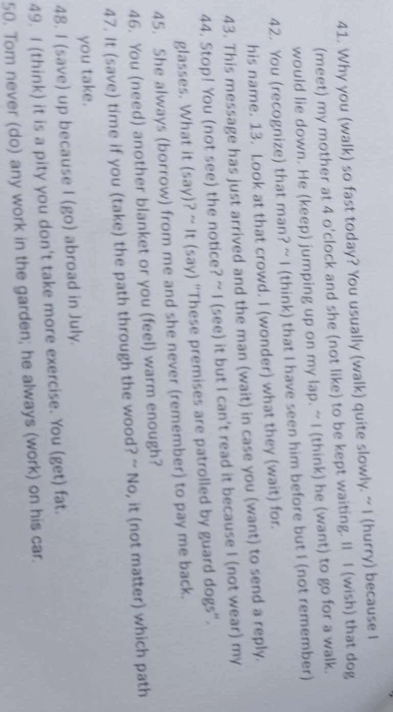 I am about to move to London and I (to try) to decide which books and things to take with me. mess (not see (say)? - me and 2. "You are he said, "Young a warm en of foolish which pa 3. Why you (to wear) an engagement ring? You are not engaged. Why are you wearing don't taka 4. It was a shock to her, but she is the kind that (not to break) down. 5. She always (to try) a little too hard to make people like her. Paris. 22 What he next wee ke the lit n the ca the 9th eresting ake) fris 6. "What he (to do) there?" "He (to write) a book, I believe." 7. He (to know) a lot of languages. snake 8. What you (to do) when you are by yourself? cognise a full- 9. "Elen (to wait) for you." "Yes, I (to know)" ut this 10. I am sorry you (not to feel) well, my dear. I fto eel tio matching 11. "Ray, come here a minute, will you?" "Oh, what you (to want)?" "Can't you see watch) TV." 12. She asked George "Well, what you (to stand) there for? What you (to think) about?" 13. What sort of parts you (to play) on the stage? the 14. What you (to do) tonight? I don't know yet. I (to think), I will stay at home. 15, Jill (to be) rude to me. Why you (not to stop) her? 16. I (not to go) home for lunch on Mondays. Mother (to get up) early on Mondays and (to do) her washing. 17, "Come to my room for a minute," he said You (to hear) me? Please, hurry up. I (to waiting for you!" 18. "How is John?" "He (to grow) peaches in New Carolina." 19. The phone (to ring). Who is it for? 20. Where (to be) Ted? - He (to be) in the garden. He (to plant) rose bushes. 21, "I (to live) here," she said, indicating the gates. 22, "Mr. Brown (to play) cards?" he asked. 23. Be quiet, please. We (to work) at the translation and you (to make) a lot of noise. 24. He always (to go) for a walk in the evenings. 25, I don't like our neighbors. They (to be) very noisy. They always (to argue). 26, I have never tried this dish. It (to smell) delicious. 27. She doesn't like her job. She (to think) to find a new one. 28. Turn off the gas. Don't you see that the kettle (to boll)? 29. The living standards (to change), Every month things (to get) more expensive. 30. I have just started language courses. I (to learn) English. 31. We must by new plates, it is useless. You always (to break) plates, 32. 1 (to hate) to speak to him. He (to be) very boring. 33. She usually (to drink) coffee. tea in the mornings, today she (to You (hear) the wind? It (blowly very strongly tonight. 35. You (see) my car keys anywhere? -No, I (look) for them but I (not see) them. 36. He never (listen) to what you say. He always (think) about something else. 37. This book is about a man who (desert) his family and (go) to live on a Pacific Island. 38, You (understand) what the lecturer is saying? No, I (not understand) him at all. 39. What you (have) for breakfast usually? I usually (eat) a carrot and (drink) a glass of cold 40. When the curtain (rise) we (see) a group of workers. They (picket) a factory gate. 41. Why you (walk) so fast today? You usually (walk) quite (meet) my mother at 4 o'clock and she (not like) to be kept waiting. II I (wish) that dog would lie down. He (keep) jumping up on my lap. ~ 1 (think) he (want) to go for a walk. 42. You (recognize) that man? ~ I (think) that I have seen him before but I (not remember) his name. 13. Look at that crowd. I (wonder) what they (wait) for. 43. This message has just arrived and the man (wait) in case you (want) to send a reply. 44. Stop! You (not see) the notice? ~ I (see) it but I can't read it because I (not wear) my glasses. What it (say)? ~ It (say) "These premises are patrolled by guard dogs". 45. She always (borrow) from me and she never (remember) to pay me back. 46. You (need) another blanket or you (feel) warm enough? 47. It (save) time if you (take) the path through the wood?~ No, it (not matter) which path you take. 48. I (save) up because I (go) abroad in July. 49. I (think) it is a pity you don't take more exercise. You (get) fat. 50. Tom never (do) any work in the garden; he always (work) on his car.