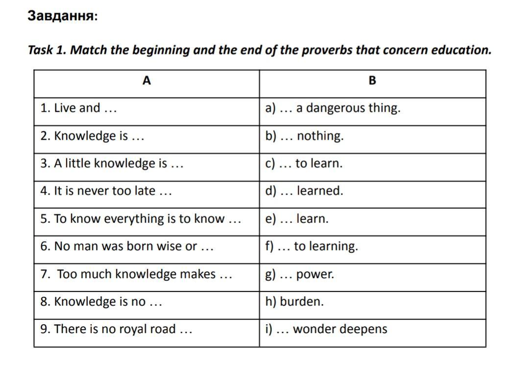 Установіть відповідність між початком і кінцем прислів’їв, які стосуються освіти.