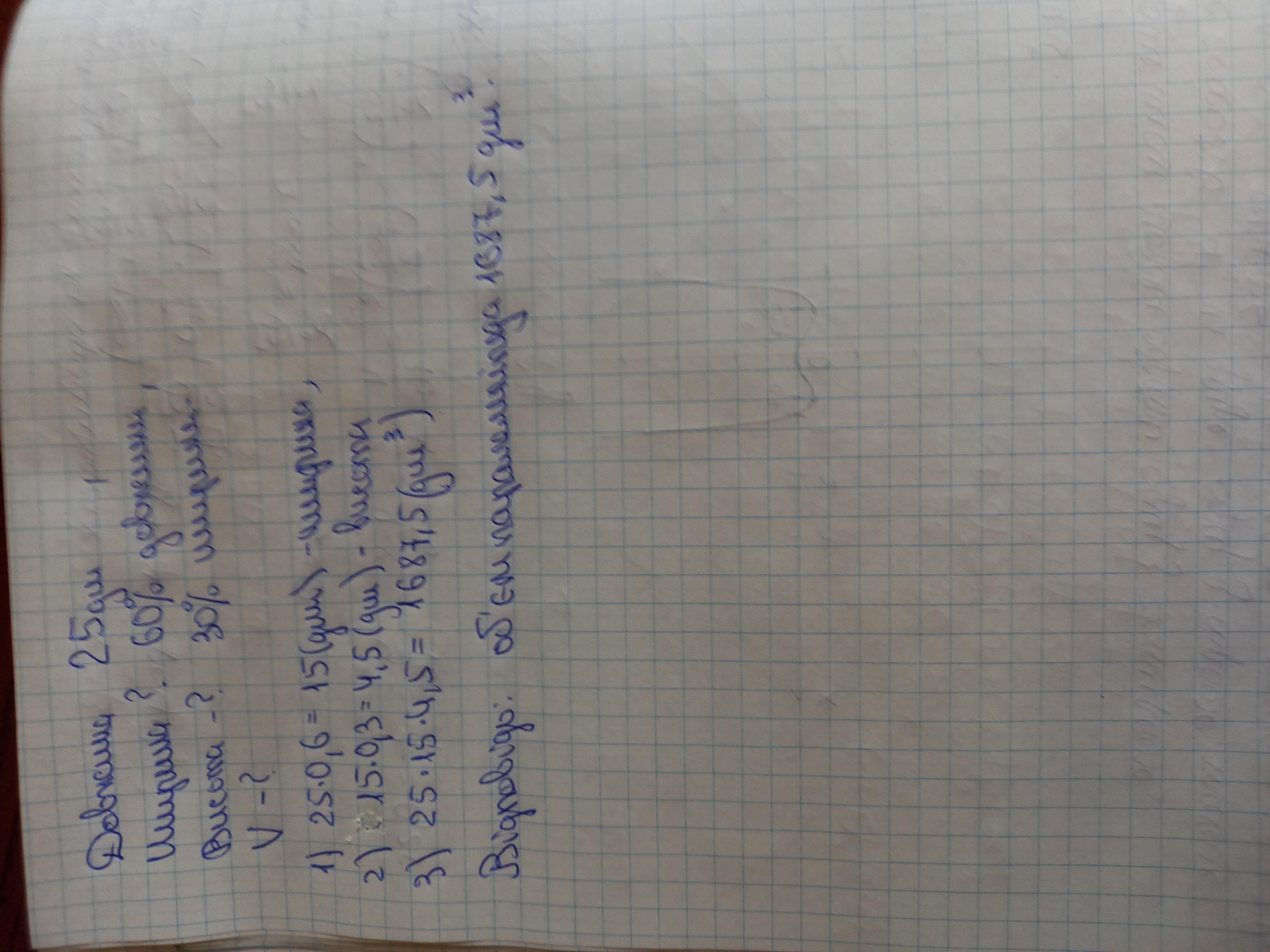 9. Довжина прямокутного паралелепіпеда дорівнює 25 дм. Ширина становить 60% довжини, а висота - 30% ширини. Знайти його об'єм.