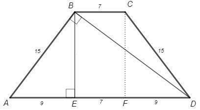 ABCD представляет собой трапецию с AB=CD, BC||AD, AD = 25 и углом ABD = 90градусов . Если E находится на AD такой, что BE перпендикулярен AD и AE = 9, найдите периметр ABCD.С рисунком пожалуйста!