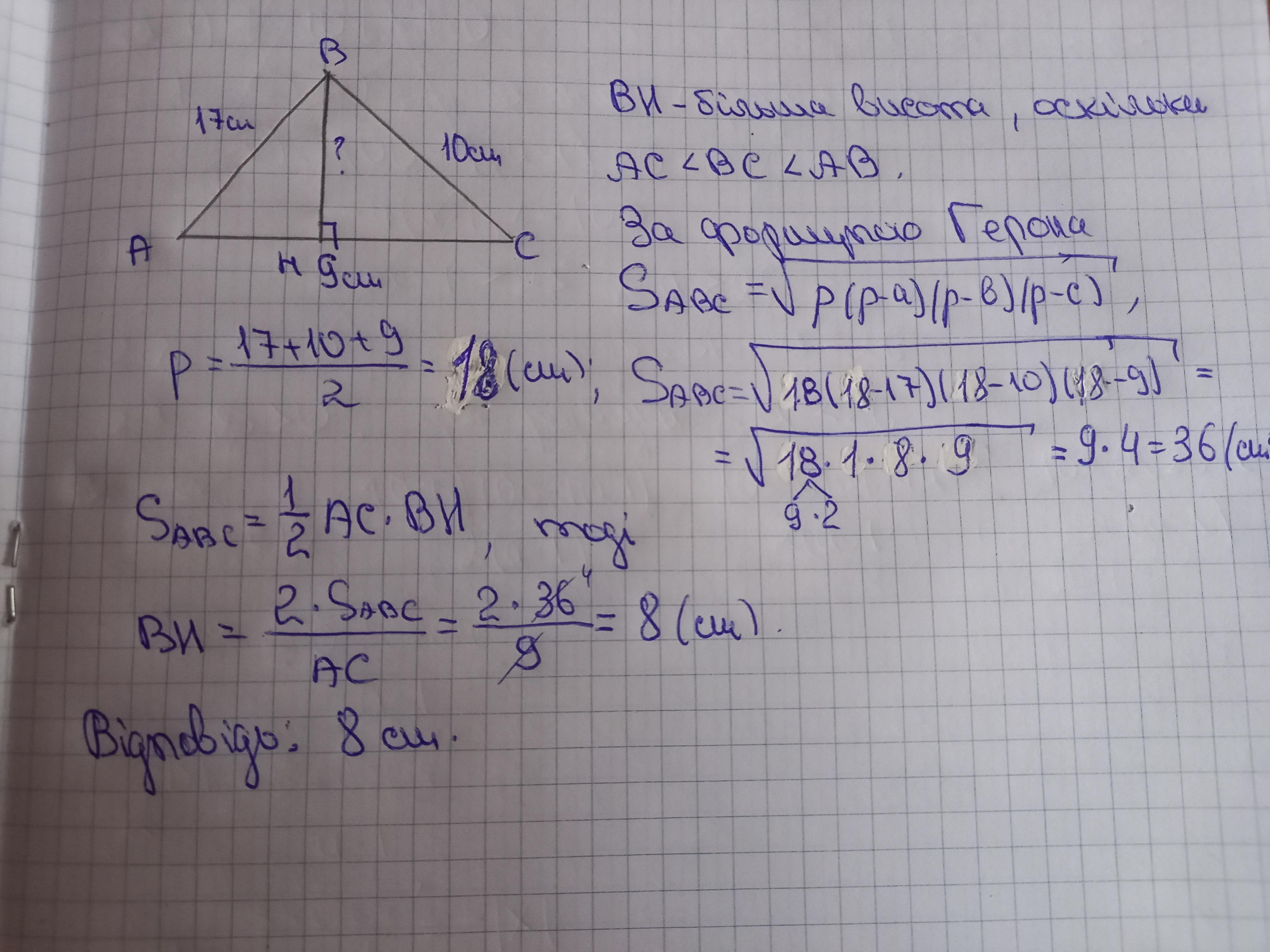 Знайдіть більшу висоту трикутника, сторони якого дорівнюють 9 см, 10 см і 17