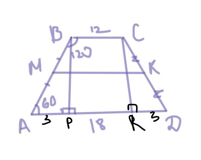 У рівнобедреній трапеції АВСД основи мають 12см і18см, кут120 градусів.Знайти середню лінію її та площу.