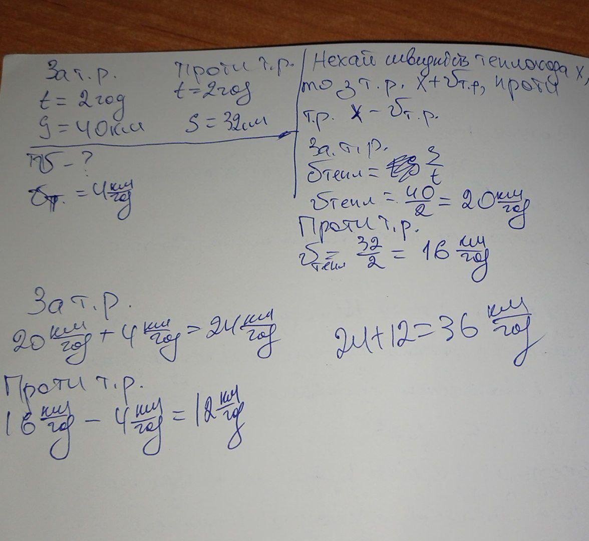 Теплохід протягом 2 годин пройшов 40 км за течією річки і 32 км проти течії річки. Знайти власну швидкість теплохода якщо швидкість течій 4 км/год