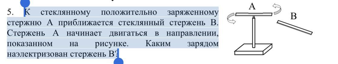 К стеклянному положительно заряженному стержню А приближается стеклянный стержень В. Стержень A начинает двигаться в направлении, показанном на рисунке. Каким зарядом наэлектризован стержень В?