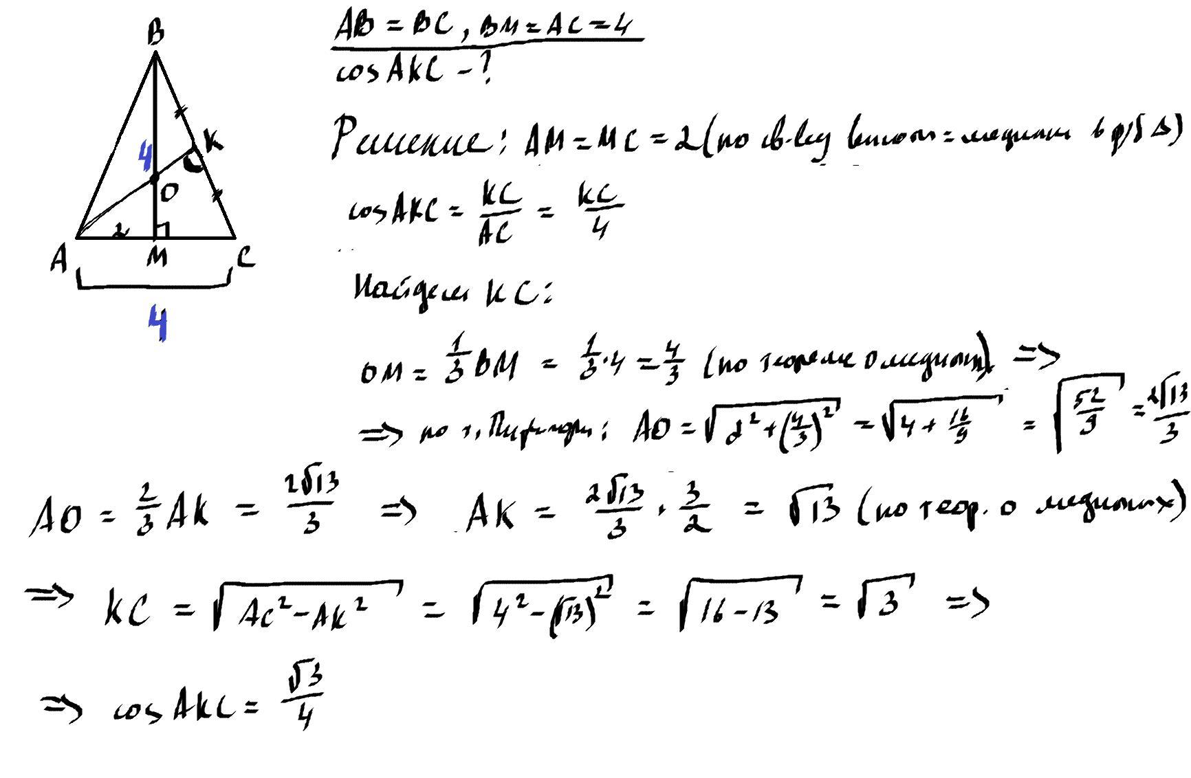 СРОЧНО, ПОЖАЛУЙСТА! Даны треугольник АВС. Основание равнобедренного треугольника АС и высота ВМ равны по 4 см. На сторону ВС проведена медиана АК. Найди cos ∠AKC.