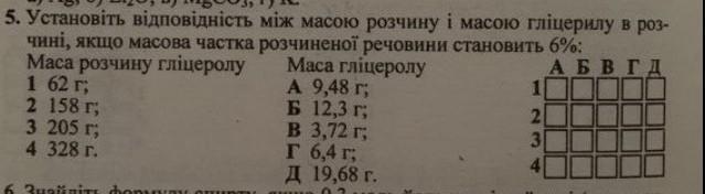 Установіть вiдповiднiсть мiж масою розчину і масою гліцерилу в розчині, якщо масова частка розчиненої речовини становить 6%