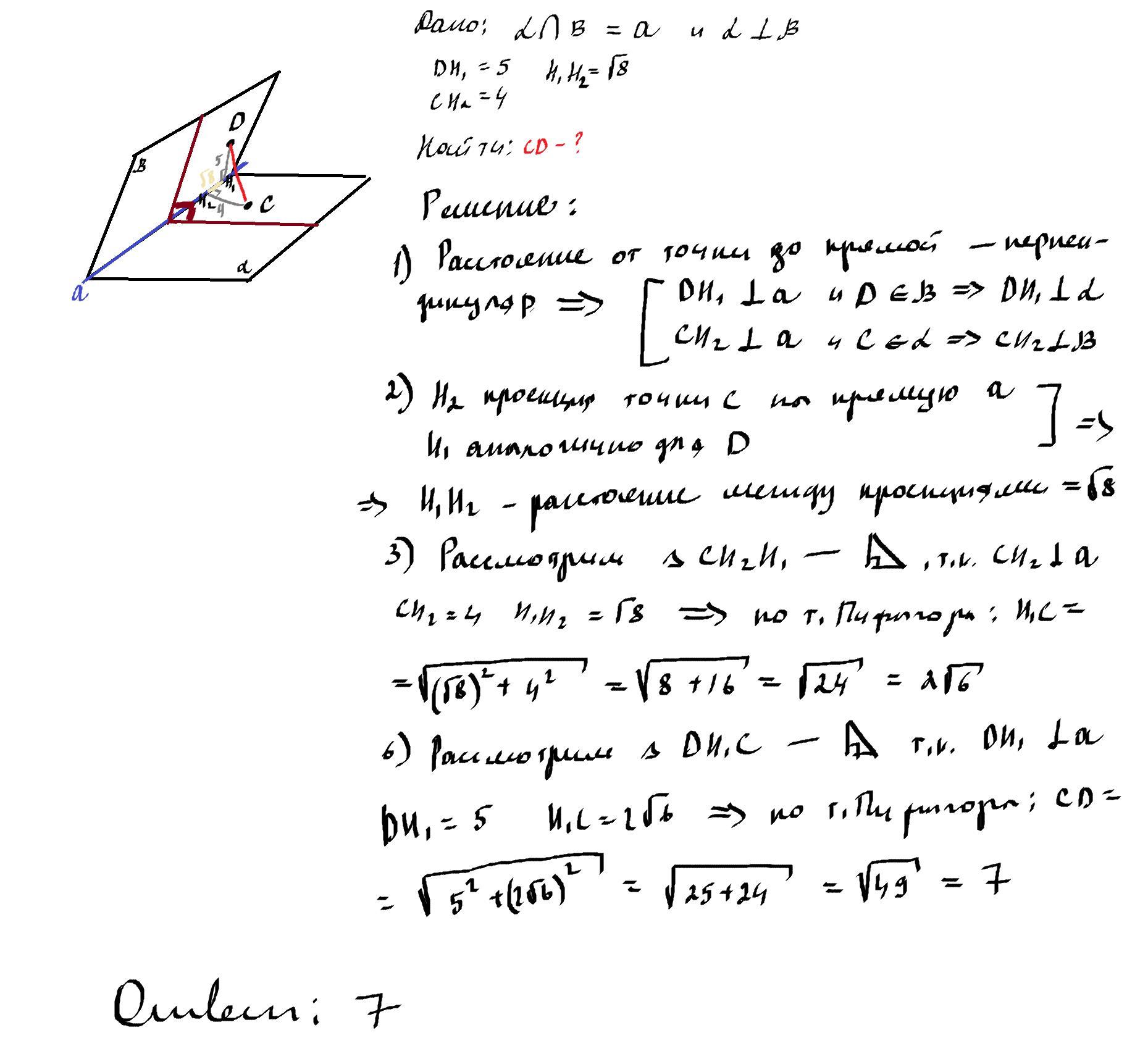 Площина α і β перпендикулярні. Пряма а лінія їхнього перетину. У площині α взято точку С, а в площині β взято точку D такі, що відстані від них до прямої а дорівнюють 4 см і 5 см відповідно. Знайти відстань між точками С і D, якщо відстань між їхніми проекціями на пряму а дорівнює √8 см.