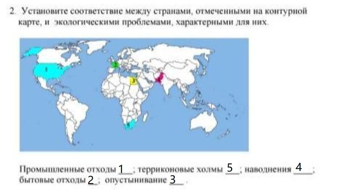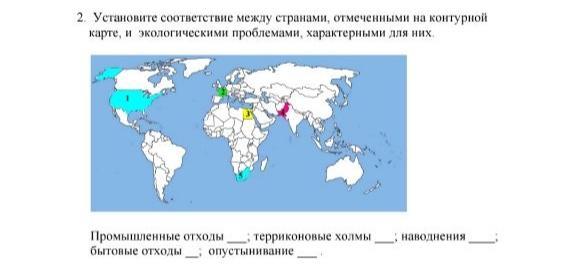 Установите соответствие между странами , отмеченными на контурной карте , и экологическими проблемами , характерными для них