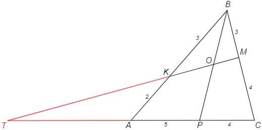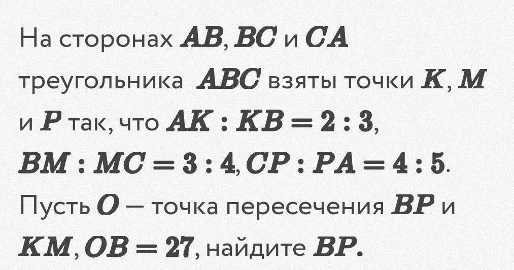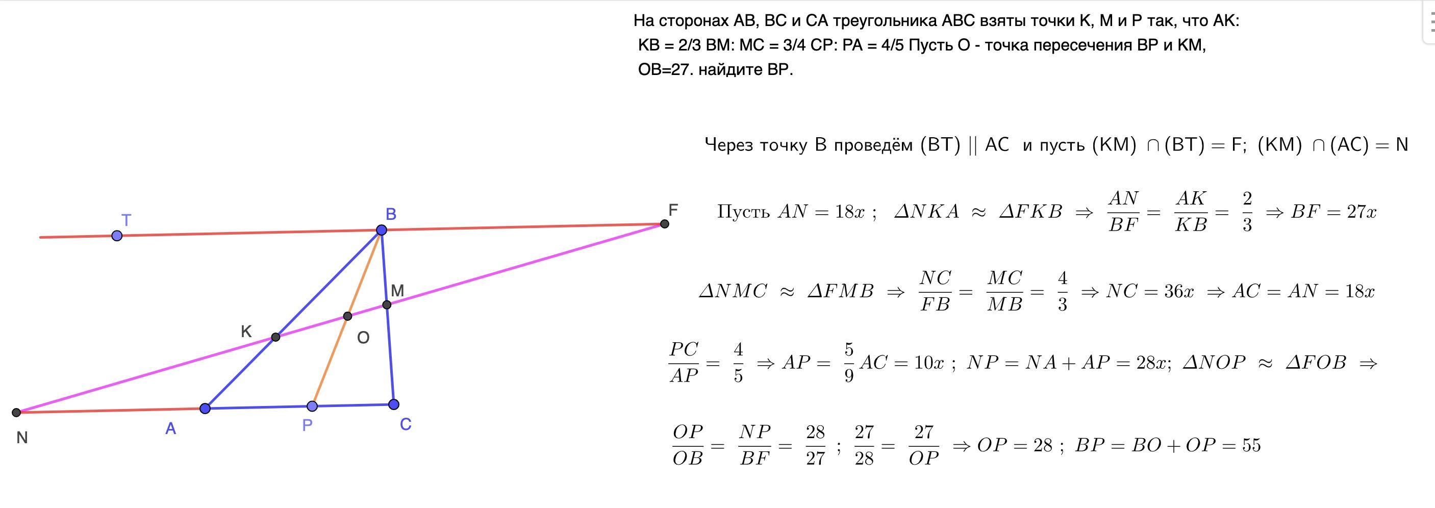 На сторонах АB, BC и CA треугольника ABC взяты точки K, M и Р так, что АК: KB = 2/3 BM: MC = 3/4 CP: PA = 4/5 Пусть О - точка пересечения ВР и KM, OB=27. найдите ВР.