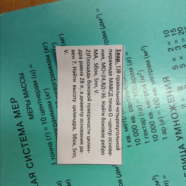 1) В правильной четырех угольной пирамиде МАВСД точка О - центр основания МО=24 ВД=36. Найти боковое ребро МА, Sбок, V