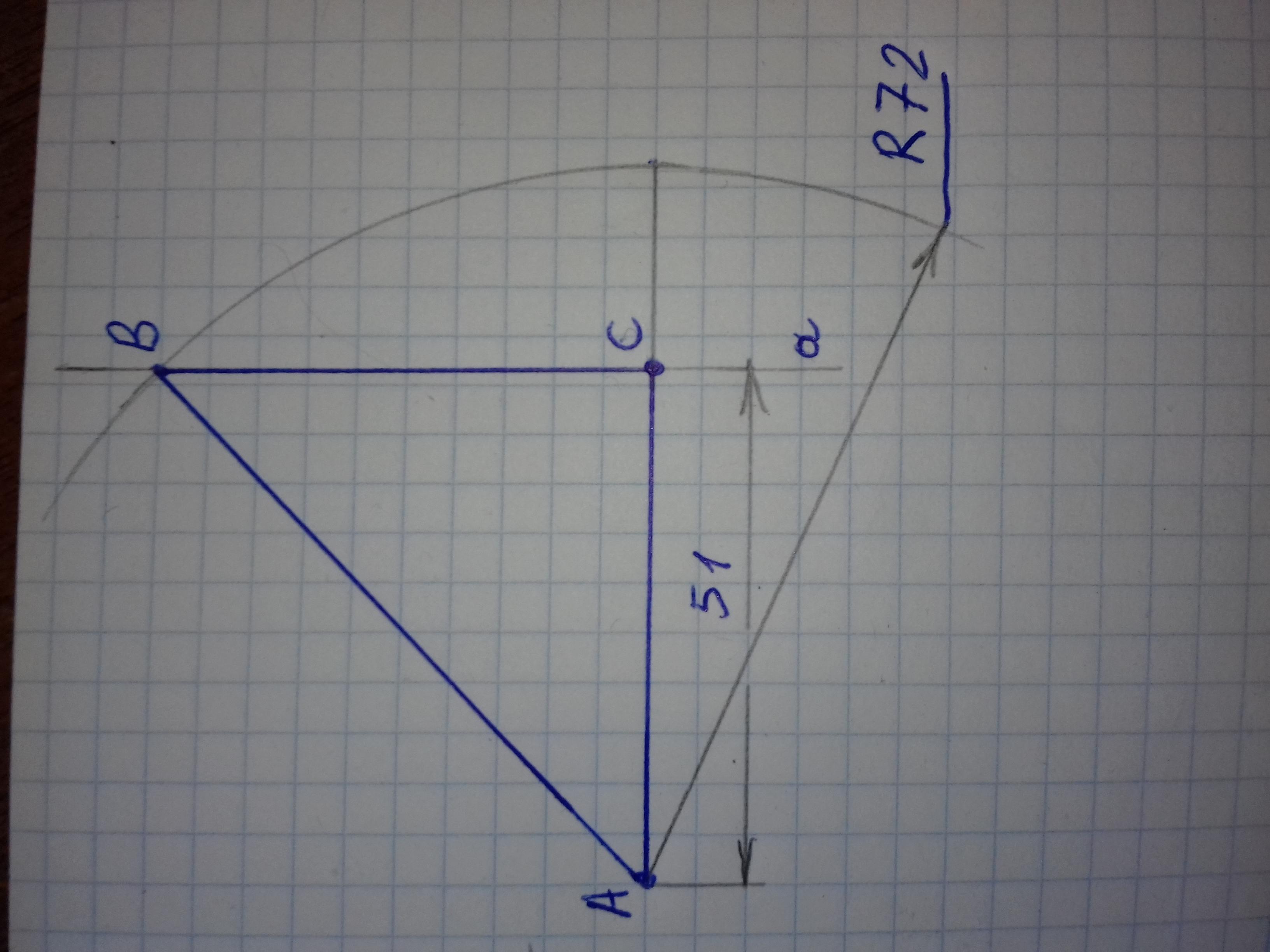 Циркулем из точки В строим дугу R = 72 мм. На пересечении дуги и прямой а получаем точку А. Соединяем точку А с точками В и С. Получаем требуемый прямоугольный треугольник.
