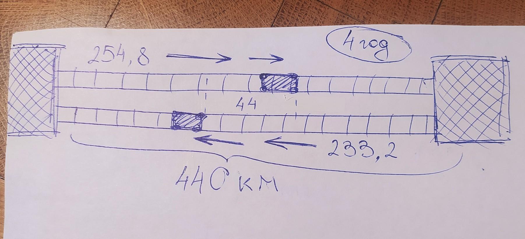 3) 254,8 + 234 = 488,8 (км) - проїхали два потяги разом за 4 години