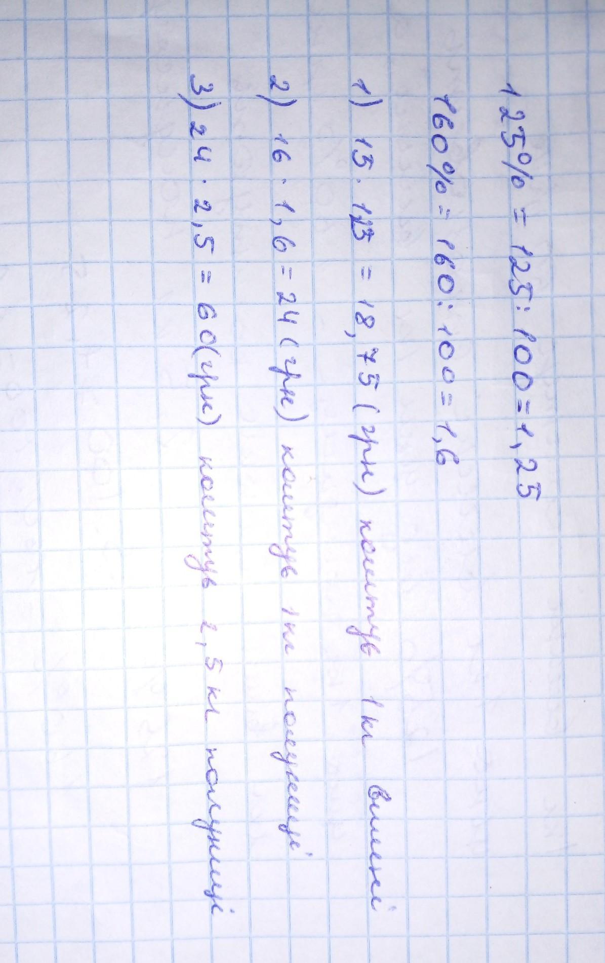 1 кг вишні коштує 60 грн., ціна 1 кг черешні становить 125 % від ціни 1 кг вишні, а ціна 1 кг полуниці — 160 % ціни 1 кг вишні. Скільки коштують 2,5 кг полуниці?