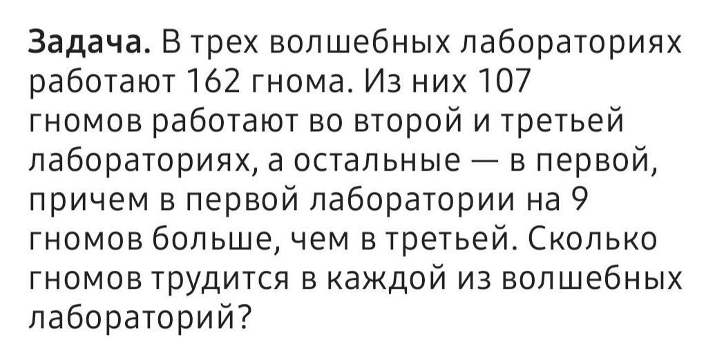 Пошаговое объяснение: 162-107=55 гномов в первой лаборатории,