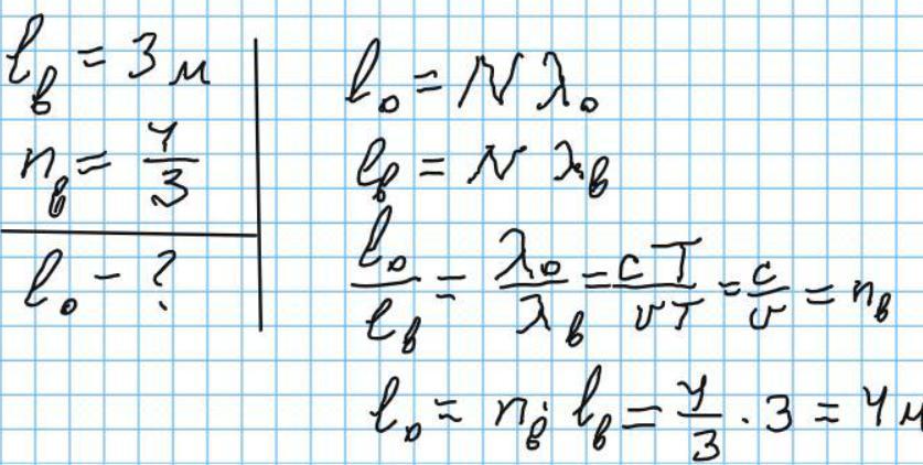 Визначити довжину відрізка, на якому вкладається стільки довжин хвиль у вакуумі, скільки їх вкладається на відрізку 3 м у воді. Показник заломлення води 4/3.