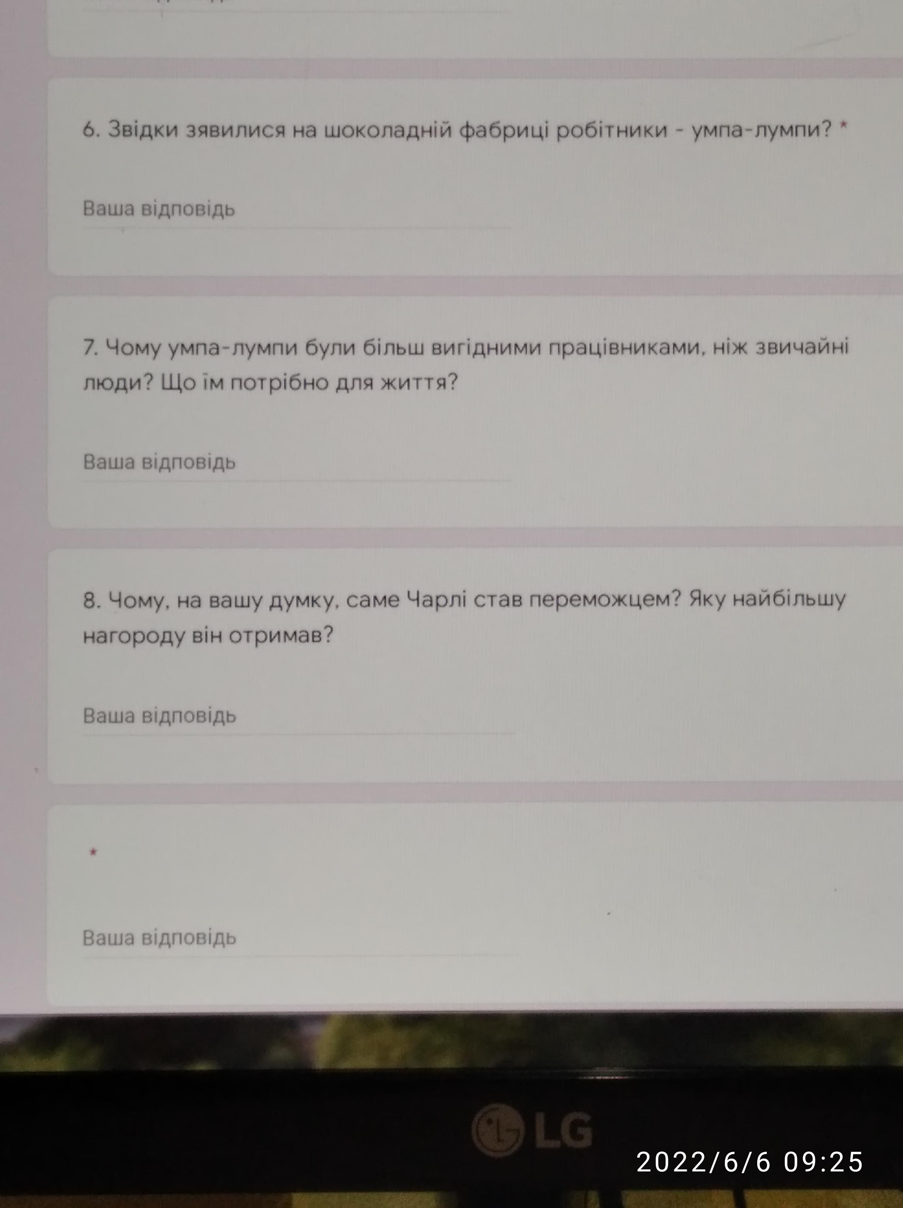 6 Умпа-лумпів Віллі Вонка завіз з далекого острову (пообіцяв їм за роботу стільки какао бобів, скільки вони забажають)
