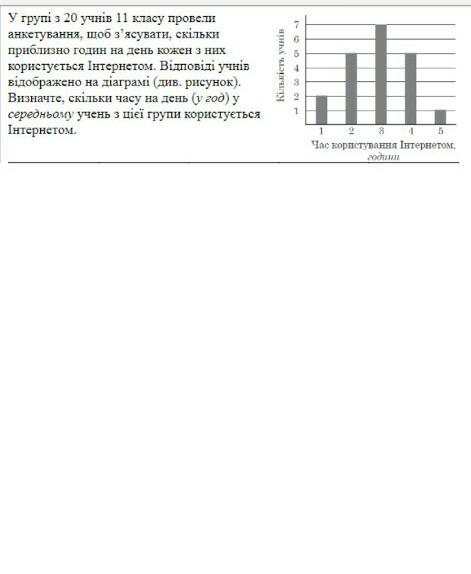 У групі з 20 учнів 11 класу провели анкетування, щоб з'ясувати, скільки приблизно годин на день кожен з них користується Інтернетом. Відповіді учнів відображено на діаграмі (див. рисунок). Визначте, скільки часу на день (у год) у середньому учень з цiеï групи користується Інтернетом. Кількість учнів 1 2 2 3 4 5 Час користування Інтернетом, години