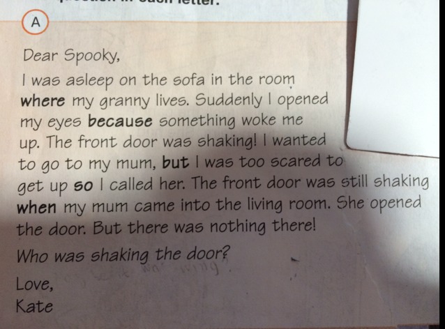 Я спал на диване в комнате, где живет моя бабуля. Внезапно я открыл мои глаза потому что кто-то разбудил меня. Входная дверь дрожала. Я хотел пойти к моей маме, но я был так напуган, что встав, крикнул ей. Передняя дверь все еще тряслась, когда мама зашла во внутрь комнаты. Она открыла дверь. Но там ничегошеньки не было. Кто тряс дверь? Люблю, Кэйт.