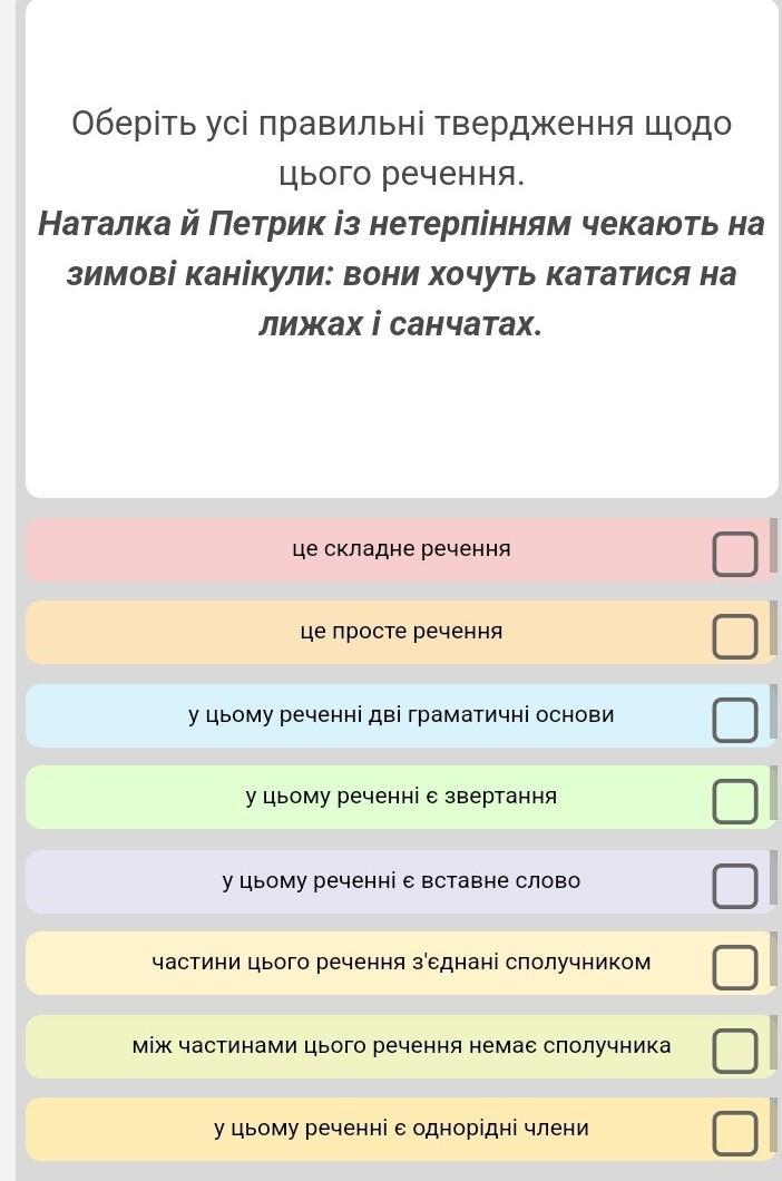 Оберіть усі правильні твердження щодо цього речення. Наталка й Петрик із нетерпінням чекають на зимові канікули: вони хочуть кататися на лижах і санчатах. це складне речення це просте речення У цьому реченні дві граматичні основи У цьому реченні є звертання У цьому реченні є вставне слово частини цього речення з'єднані сполучником між частинами цього речення немає сполучника У цьому реченні є однорідні члени ПОЖАЛУЙСТА ПОМОГИТЕ ДАМ 57 БАЛОВ