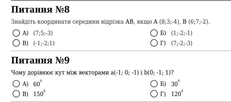 1. Щоб знайти координати середини відрізка потрібно: (x1+x2/2; y1+y2/2; z1+z2/2) Якщо A(8;3;-4) B(6;7;-2) то середина відрізка С(8+6/2;7+3/2;-2+(-4)/2) => C(7;5;-3)