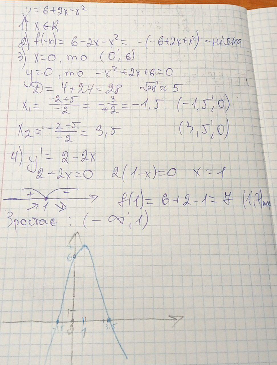 Побудувати графік функції у = 6 + 2x - x2 ( розв'язок завдання прислати у вайбер). За графіком знайдіть: 1) область значень; 2) проміжок зростання функції.