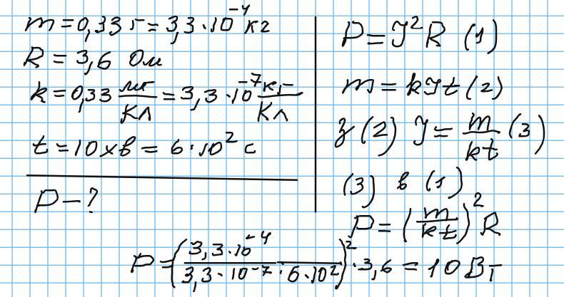 В електролітичній ванні за 10 хв виділилося 0,33 г мiдi. Опір розчину мідного купоросу становить 3,6 Ом. Визначте потужність струму, який про- ходить через розчин. Електрохімічний еквівалент міді дорівнює 0,33 мг/Кл.