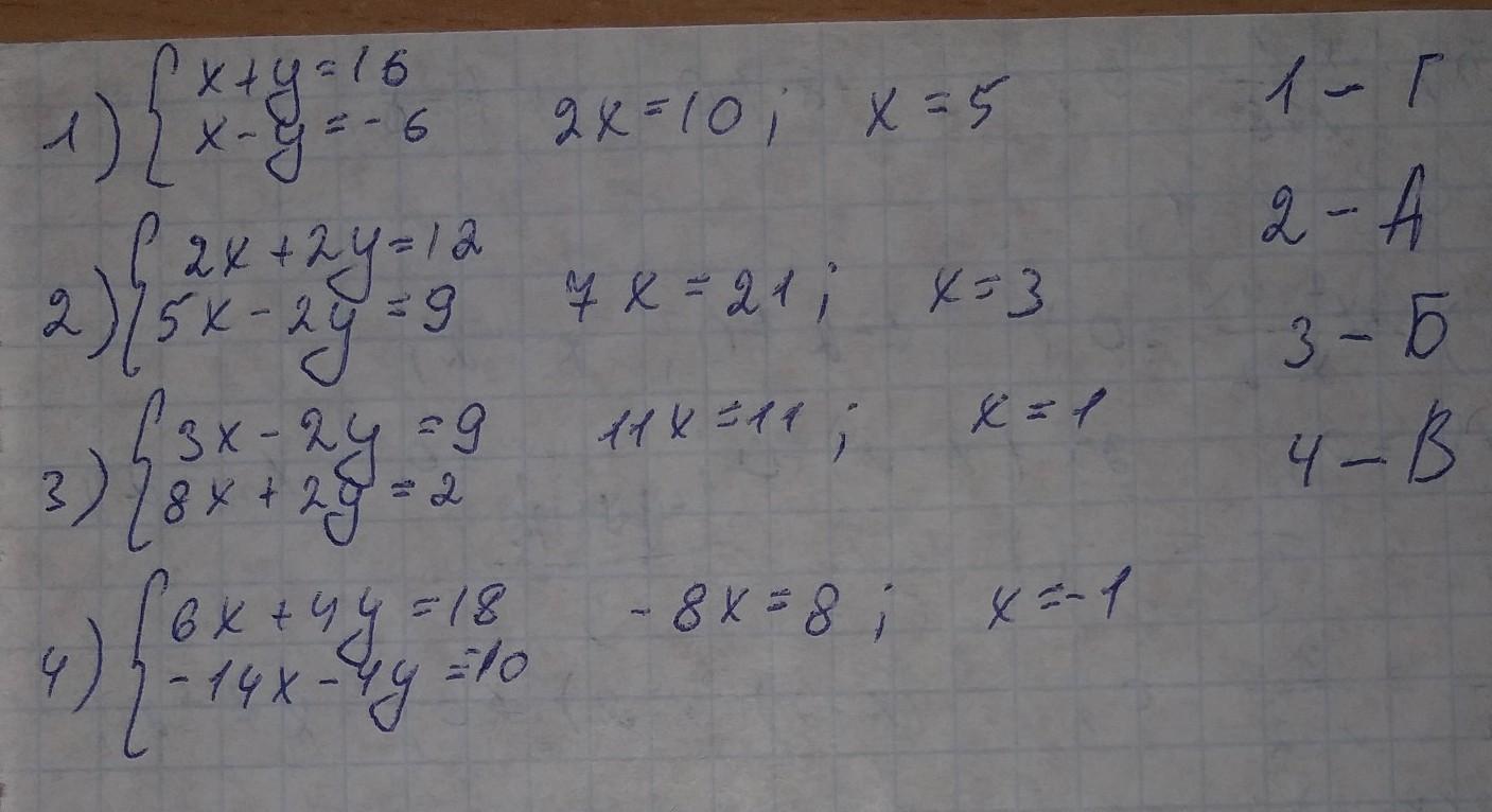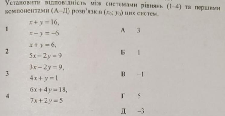 Установити відповідність між системами рівнянь (1-4) та першими компонентами (А-Д) розв'язків (x0;y0) цих систем