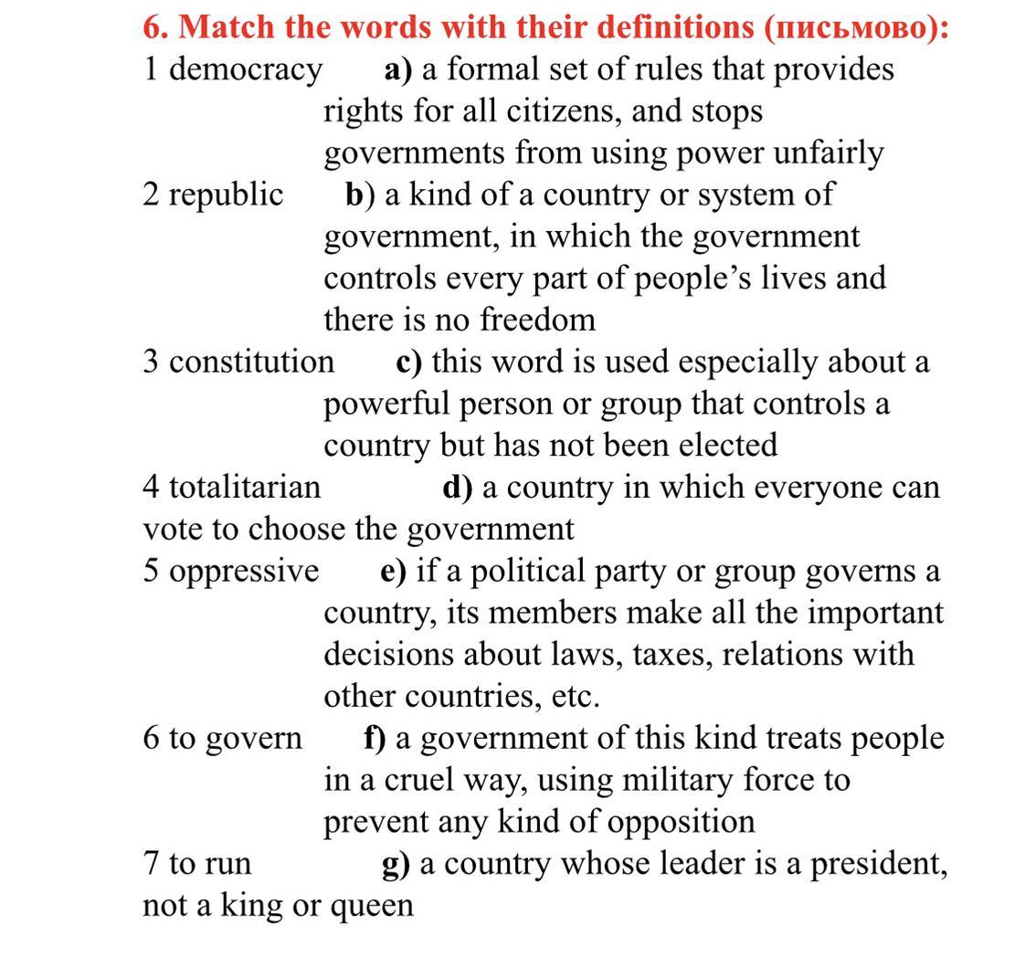 Віповідь:6. Установіть відповідність між словами та їхніми визначеннями (письМОБо): 1 демократія а) офіційний набір правил, що забезпечує права для всіх громадян і забороняє урядам використовувати владу несправедливо; б) різновид країни або системи правління, в якій уряд контролює кожну частину життя людей, і немає свободи 2 республіка 3 конституція в) це слово вживається особливо щодо могутньої особи або групи, яка контролює країну, але не була обрана 4 тоталітарна d) країна, в якій кожен може голосувати за вибрати уряд 5 репресивний e ) якщо політична партія або група керує країною , її члени приймають всі важливі рішення щодо законів , податків , відносин з іншими країнами тощо 6 , щоб керувати . жорстокий спосіб, використовуючи військову силу, щоб запобігти будь-якій опозиції 7 керувати g) країною, лідером якої є президент, а не король чи королева