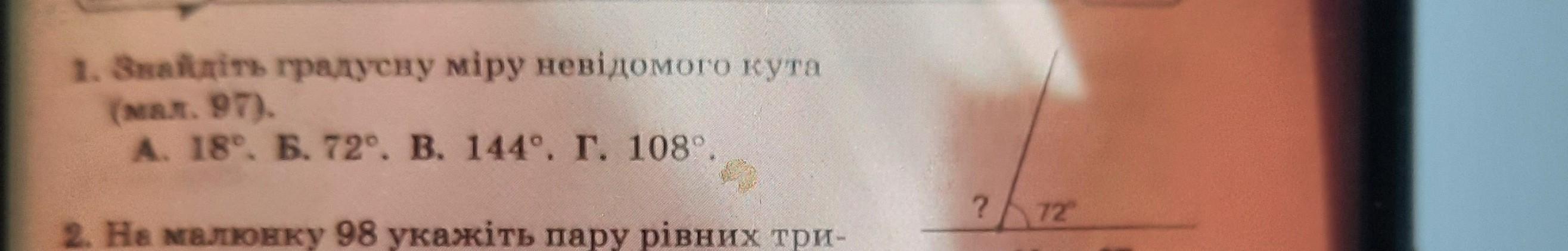 1. Знайдіть градусну міру невідомого кута (мал. 97). А. 18°. Б. 72°. B. 144°. Г. 108º. 09 viажіть пару рівних три- 112