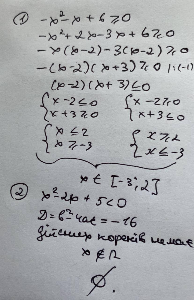 розв'яжіть нерівність: -х2-х+6 більше або дорівнює 0 та х2-2х+5менше 0.