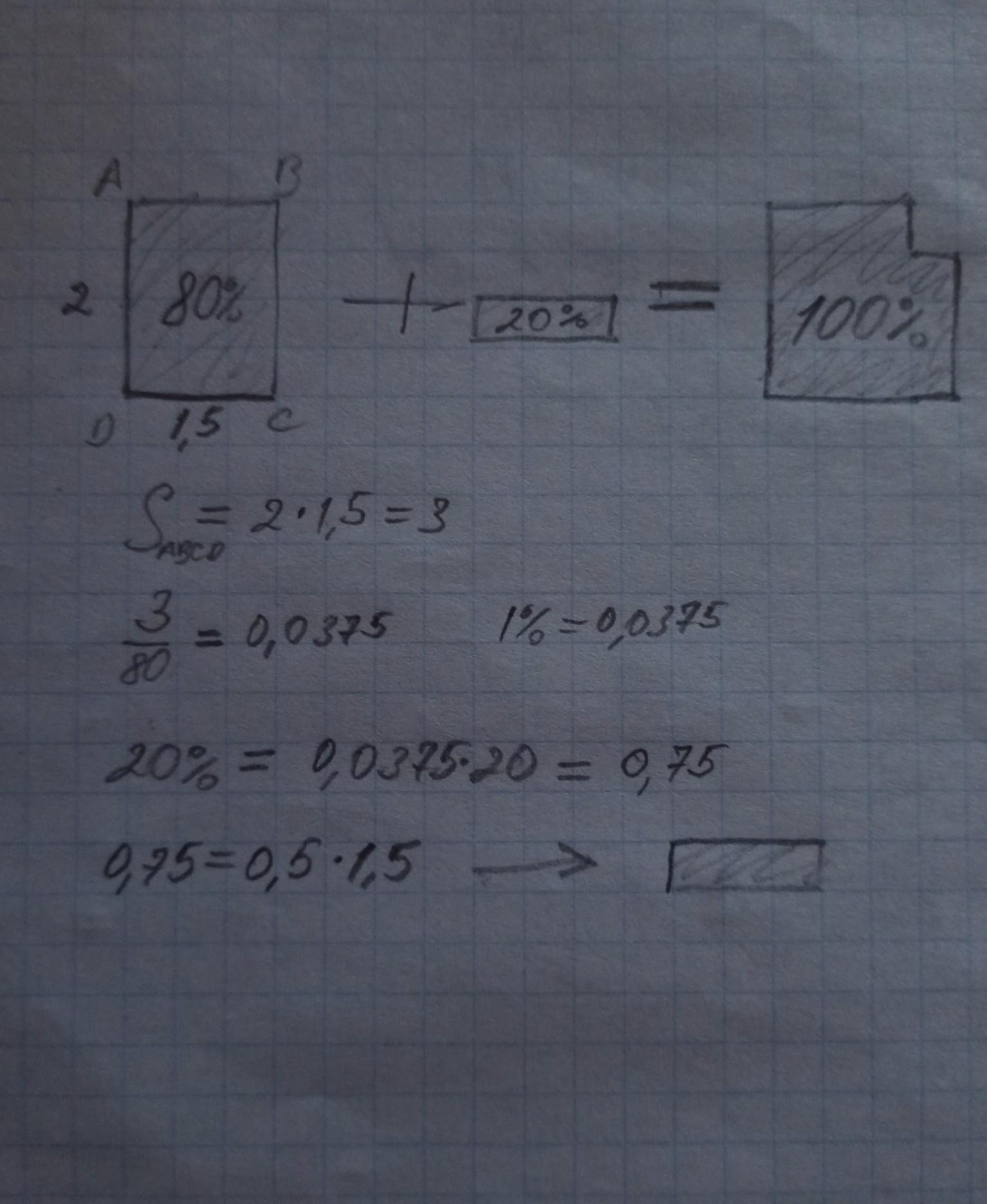 Накресли на аркуші паперу в клітинку прямокутник зі сторонами 2 см і 1,5 см. Доповни його до такої фігури, щоб площа прямокутник становила 80% площі утвореної фігури